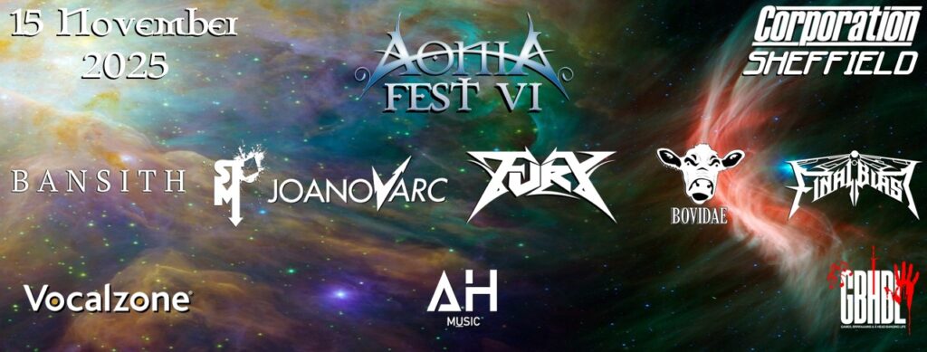 AoniaFest VI returns to Corporation, Sheffield on the 15th of November 2025. Thanks to sponsors Games, Brrraaains & A Head-Banging Life, ticket prices have remained at just £12.50 for 7 incredible bands! We are also grateful to Vocalzone and AH Music for their endorsement of the event!